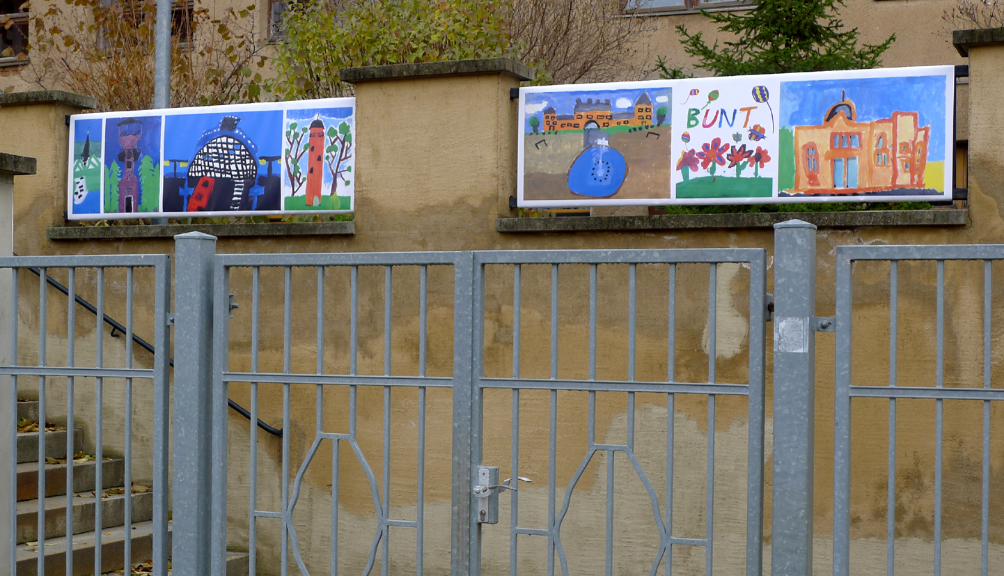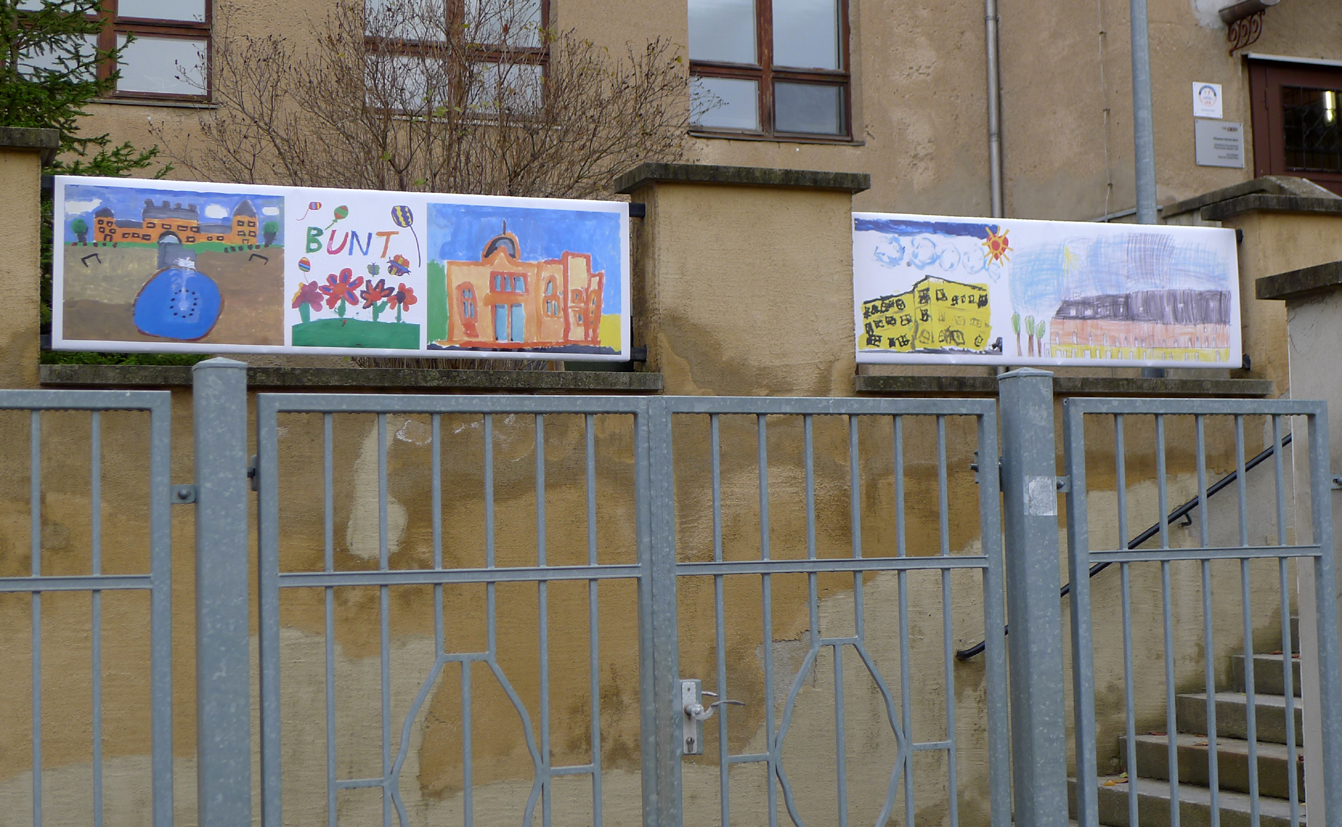 Angeregt vom Projekt Demokratiepassage haben Kinder der Pfortener Grundschule die Außenfassade ihrer Schule verschönert. Die Drittklässler*innen haben – wieder gemeinsam mit Sven Schmidt – einen Kartenblock mit Stadtansichten Geras entworfen. Die sieben Banner wurden an der Schule befestigt und setzen einen bunten Kontrastpunkt zur sonst eher grauen Schulfassade. Das Projekt Räume der Demokratie — Das ist unser Gera wirbt so auf einzigartiger Weise für ein demokratisches, kinderfreundliches Gera.